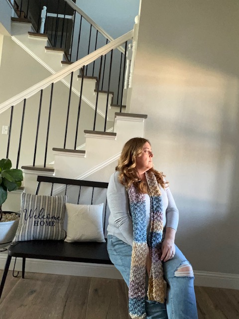 For my sample, I used Mandala Watercolors in Wild Pansy, a soft, self-striping bulky yarn that adds beautiful color transitions without any extra effort. The rich tones and subtle halo make every stitch stand out. But don’t feel limited — any bulky (#5) yarn will work wonderfully, and the pattern is easy to adjust for different weights or lengths.